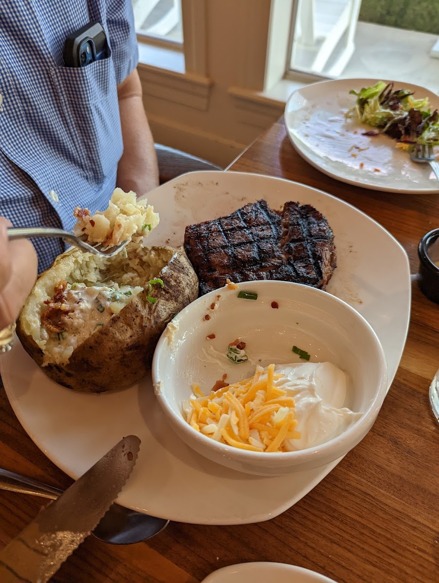 The food was surprisingly good. They can customize your order a bit to help get what you want. My wife ordered prime rib med well and it came out bleeding so she didn't end up eating there. The atmosphere was pleasing and the view to the golf course was beautiful. Our waitress was super friendly and even recommended what drinks my wife should try. Service was speedy. Will go back and eat here again.