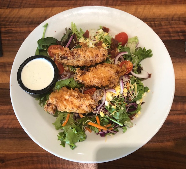 I have not had a really good Club sandwich in years. I was craving one. A club sandwich is one of those safety meals, you order when travelling and stop to eat at an unfamiliar diner. They are pretty hard to screw up. They can be very good or average, but seldom really bad. I was just in the mood for one. The most reliable place to find a Club Sandwich is always at a golf course “club” house restaurant or snack bar. The great waitress delivered a photogenic, diner menu picture, master piece, of a Club Sandwich; on the plate with delicious crispy fries. Excellent! Hankering assuaged! The Crispy Chicken Salad….. My wife was reporting favorably on the fried chicken before she had hardly finished the first bite. The salad was fresh mixed greens with egg, tomato, bacon, cheese, onion and of course, three just out of the fryer, chicken strips. She chose to dress the salad with what appeared to be house made ranch dressing. Great salad. The dining area is large and comfortable with a view of the course. You can enjoy the view or watch whatever sport happens to be on one of the big screen TVs. Very good service A very pleasant lunch experience!