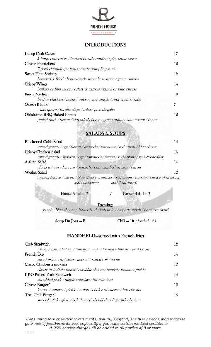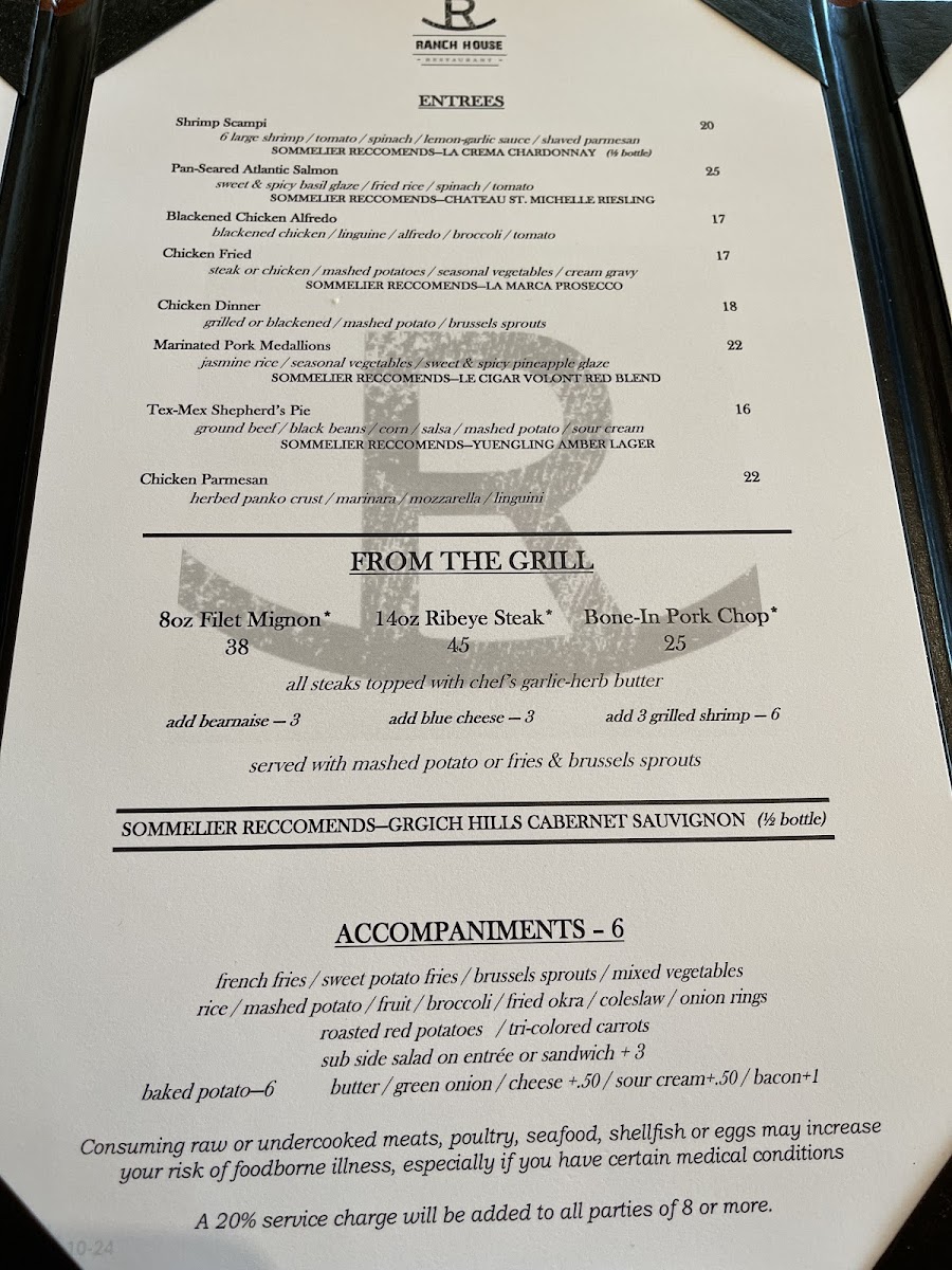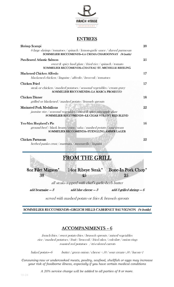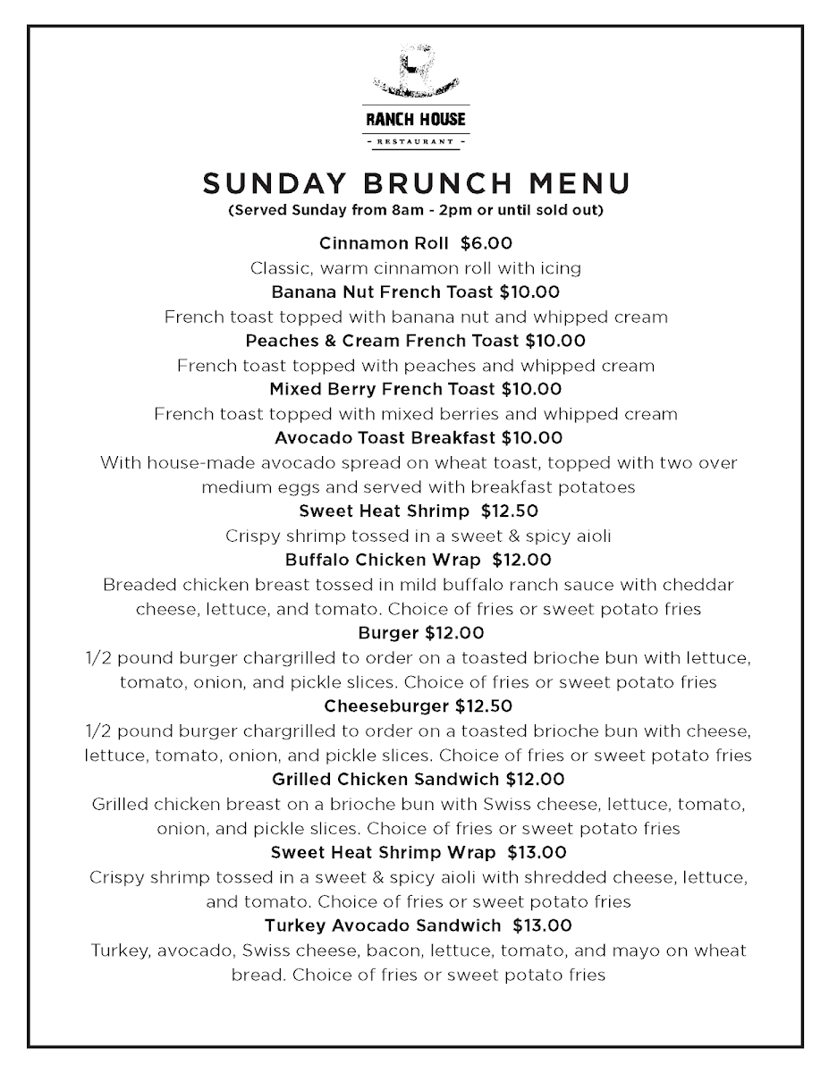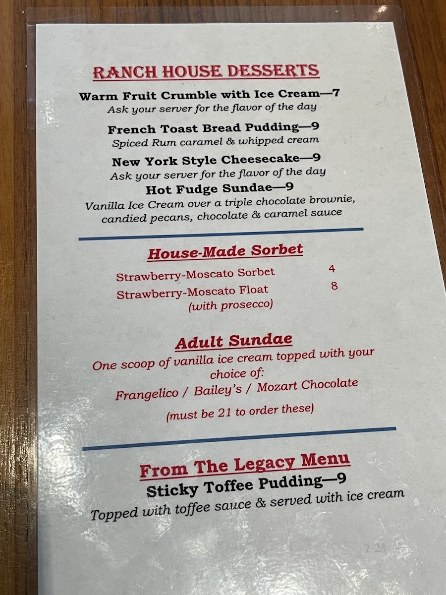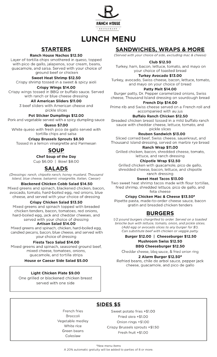 Guests often enjoy the homey flavors of the Ranch House Legacy Dishes, which pair well with the cozy, laid-back atmosphere of the restaurant. Many dishes, from Crispy Brussels Sprouts to Spicy Shrimp Tacos, provide a satisfying balance between traditional comfort and subtle creativity, making it easy to find something for nearly any craving or occasion. Light bites like the Club Sandwich or the Turkey Avocado Bacon Sandwich move seamlessly from midday meals to evening gatherings.